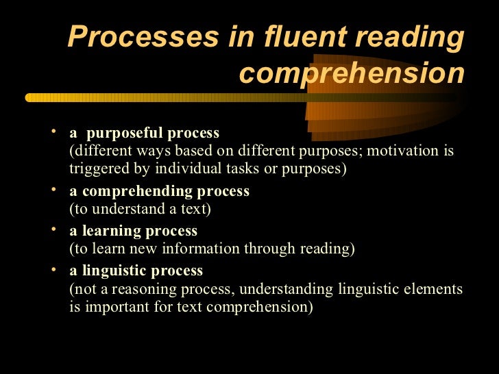 - 12. Processes in fluent reading comprehension• a purposeful process (different ways based on different purposes; motivation is triggered by individual tasks or purposes)• a comprehending process (to understand a text)• a learning process (to learn new information through reading)• a linguistic process (not a reasoning process, understanding linguistic elements is important for text comprehension)