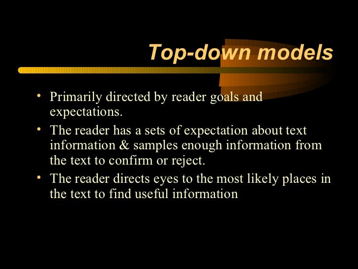 - 16. Top-down models• Primarily directed by reader goals and expectations.• The reader has a sets of expectation about text information & samples enough information from the text to confirm or reject.• The reader directs eyes to the most likely places in the text to find useful information