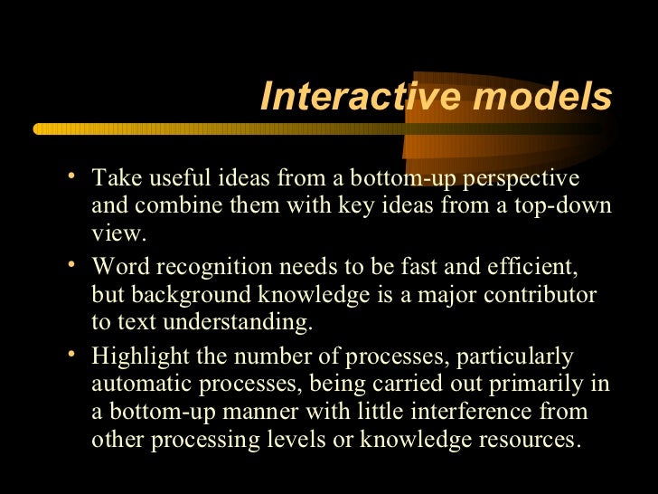 - 17. Interactive models• Take useful ideas from a bottom-up perspective and combine them with key ideas from a top-down view.• Word recognition needs to be fast and efficient, but background knowledge is a major contributor to text understanding.• Highlight the number of processes, particularly automatic processes, being carried out primarily in a bottom-up manner with little interference from other processing levels or knowledge resources.