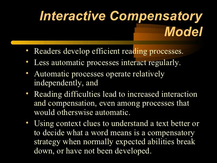 - 19. Interactive Compensatory Model• Readers develop efficient reading processes.• Less automatic processes interact regularly.• Automatic processes operate relatively independently, and• Reading difficulties lead to increased interaction and compensation, even among processes that would otherswise automatic.• Using context clues to understand a text better or to decide what a word means is a compensatory strategy when normally expected abilities break down, or have not been developed..