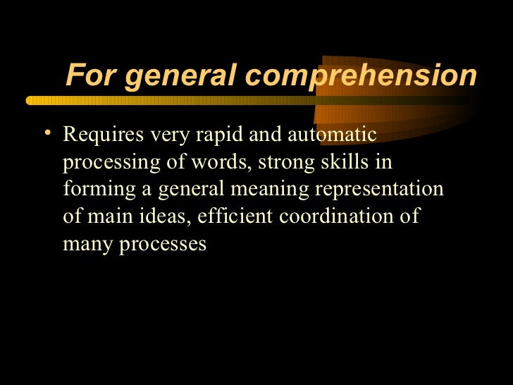 - 6. For general comprehension• Requires very rapid and automatic processing of words, strong skills in forming a general meaning representation of main ideas, efficient coordination of many processes