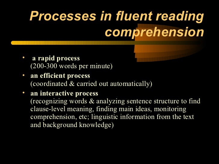 - 9. Processes in fluent reading comprehension• a rapid process (200-300 words per minute)• an efficient process (coordinated & carried out automatically)• an interactive process (recognizing words & analyzing sentence structure to find clause-level meaning, finding main ideas, monitoring comprehension, etc; linguistic information from the text and background knowledge)